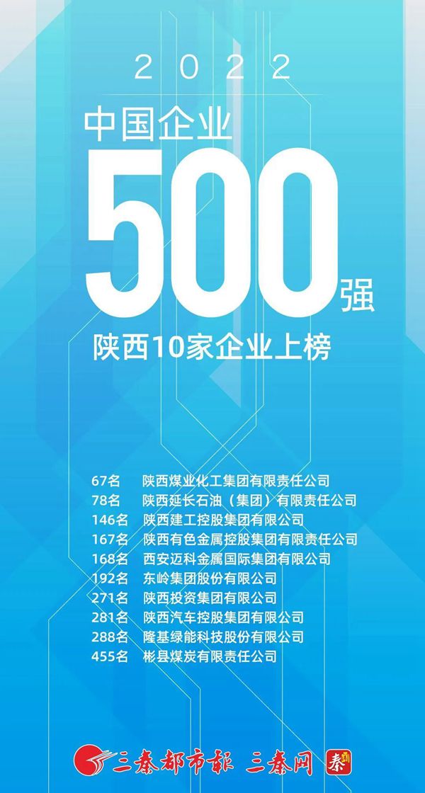 陜煤集團位列2022中國企業(yè)500強第67位,蟬聯(lián)上榜陜企第一